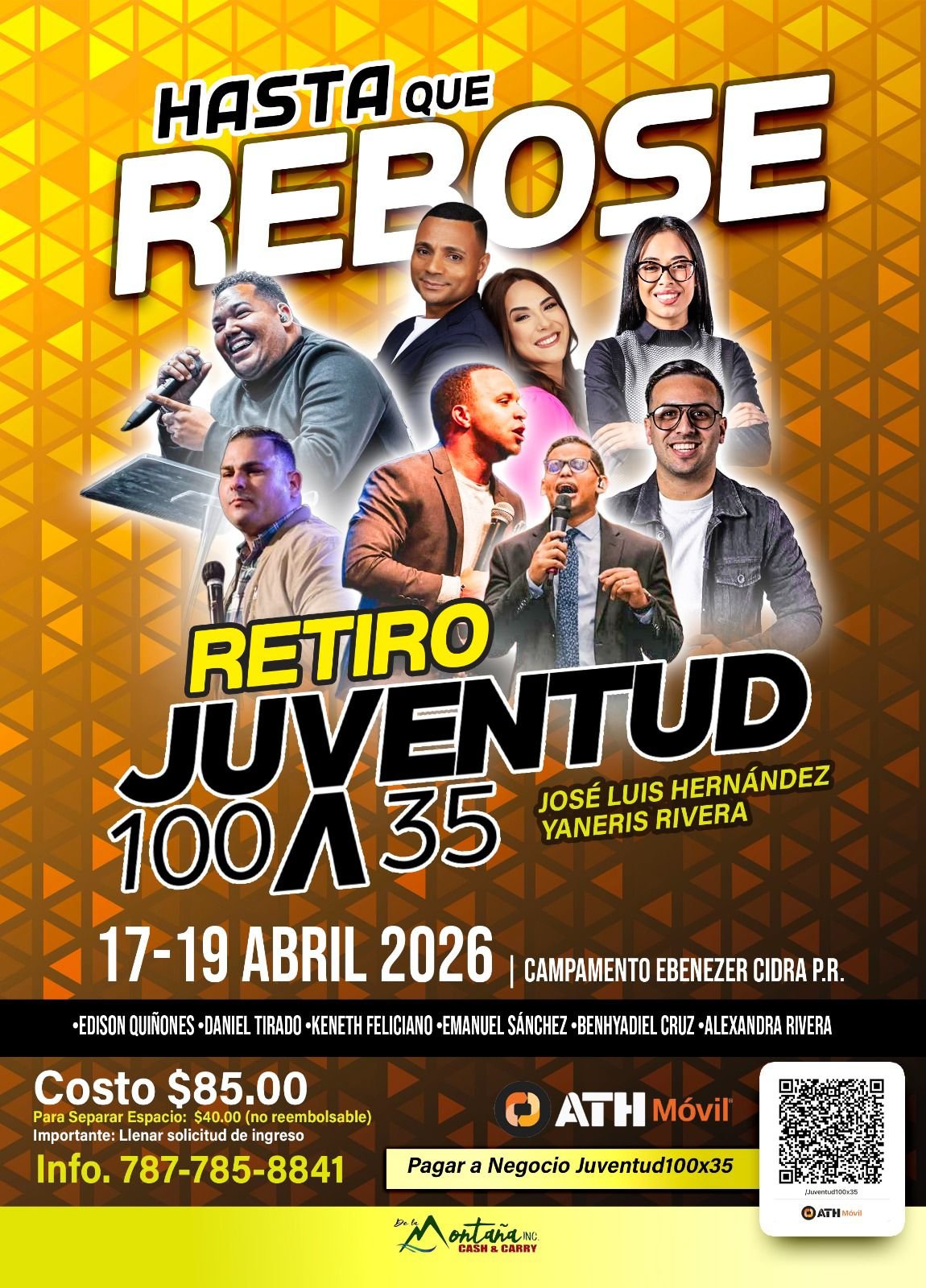 April 17 @ 7:30 pm - April 19 @ 12:00 pm Hasta Que Rebose (Retiro) Juventud 100X35 Ruge Campamento Ebenezer, Cidra 5VCF+VXR, Cidra, Puerto Rico $85